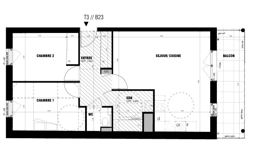 Vous y trouverez cet appartement 3 pièces de 63 m² au 2ème étage comprenant : un séjour-cuisine de 26 m² donnant sur un balcon d’environ 10 m², 2 chambres dont une avec placard, une salle de bain, WC séparé.